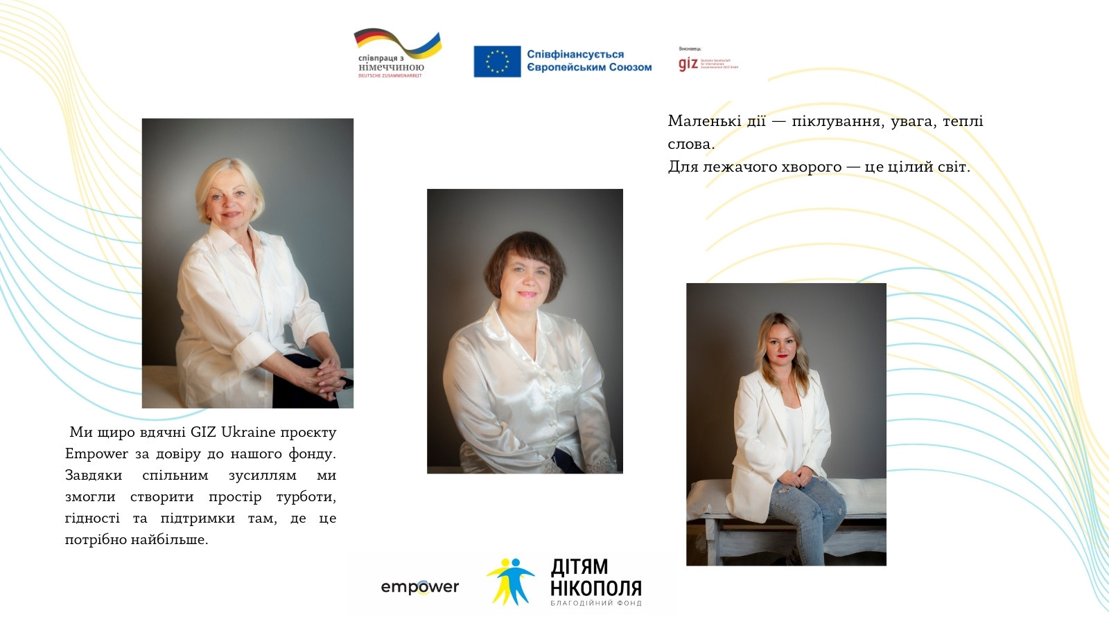 Ми щиро вдячні GIZ Ukraine проєкту Empower за довіру до нашого фонду. Завдяки спільним зусиллям ми змогли створити простір турботи, гідності та підтримки там, де це потрібно найбільше.